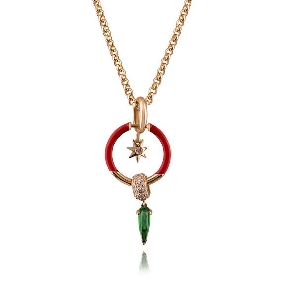 Колье из желтого золота с тремя съемными подвесками с бриллиантом и кораллом