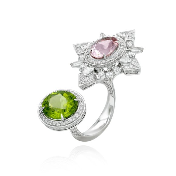Кольцо из белого золота с хризолитом 4.83 ct, морганитом 2.85 ct, сапфирами и бриллиантами