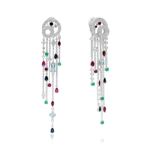 Серьги из белого золота с сапфирами, рубинами, изумрудами, бриллиантами и топазами
