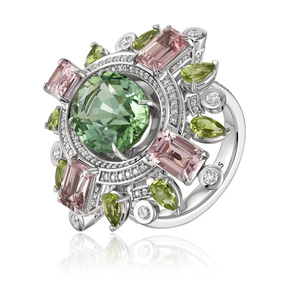 Кольцо из белого золота с бриллиантами, хризолитами 1.85 ct, морганитами 3.465 ct и турмалином 7.38 ct