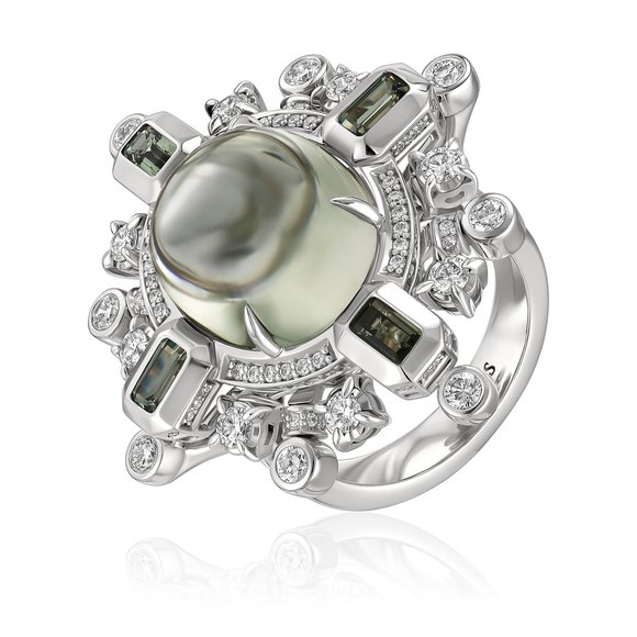 Кольцо из белого золота с сапфирами, бриллиантами, жемчугом и турмалином 22.94 ct