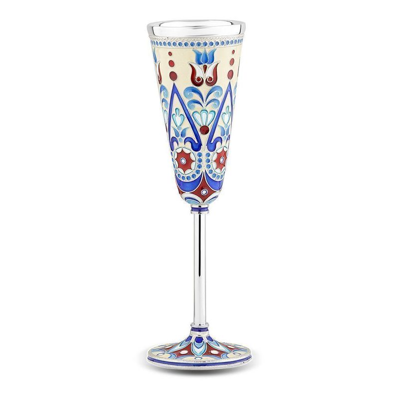 Изысканная коллекция посуды, состоящая из чайного набора, бокалов и стопок, выполненных в эмалево-филигранной технике, отражает роскошь и индивидуальность. Утонченность и элегантность, серебро и золото, изящество и блеск - переплетение двух сил рождает богатство жизни, наслаждение и удовольствие.