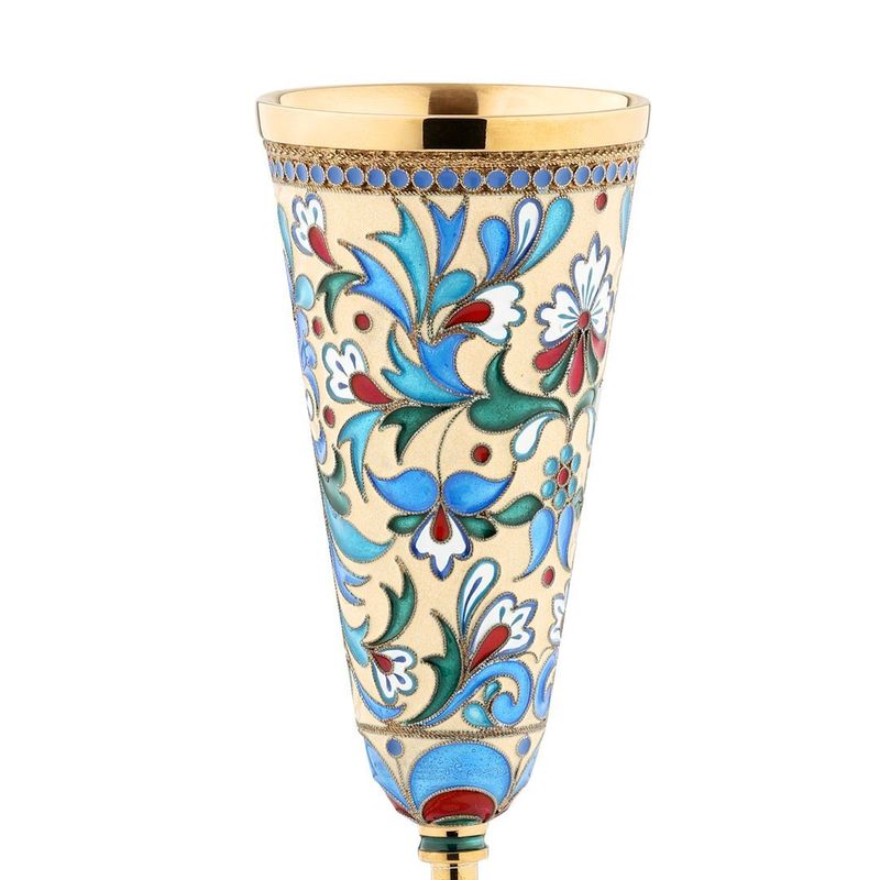 Изысканная коллекция посуды, состоящая из чайного набора, бокалов и стопок, выполненных в эмалево-филигранной технике, отражает роскошь и индивидуальность. Утонченность и элегантность, серебро и золото, изящество и блеск - переплетение двух сил рождает богатство жизни, наслаждение и удовольствие.