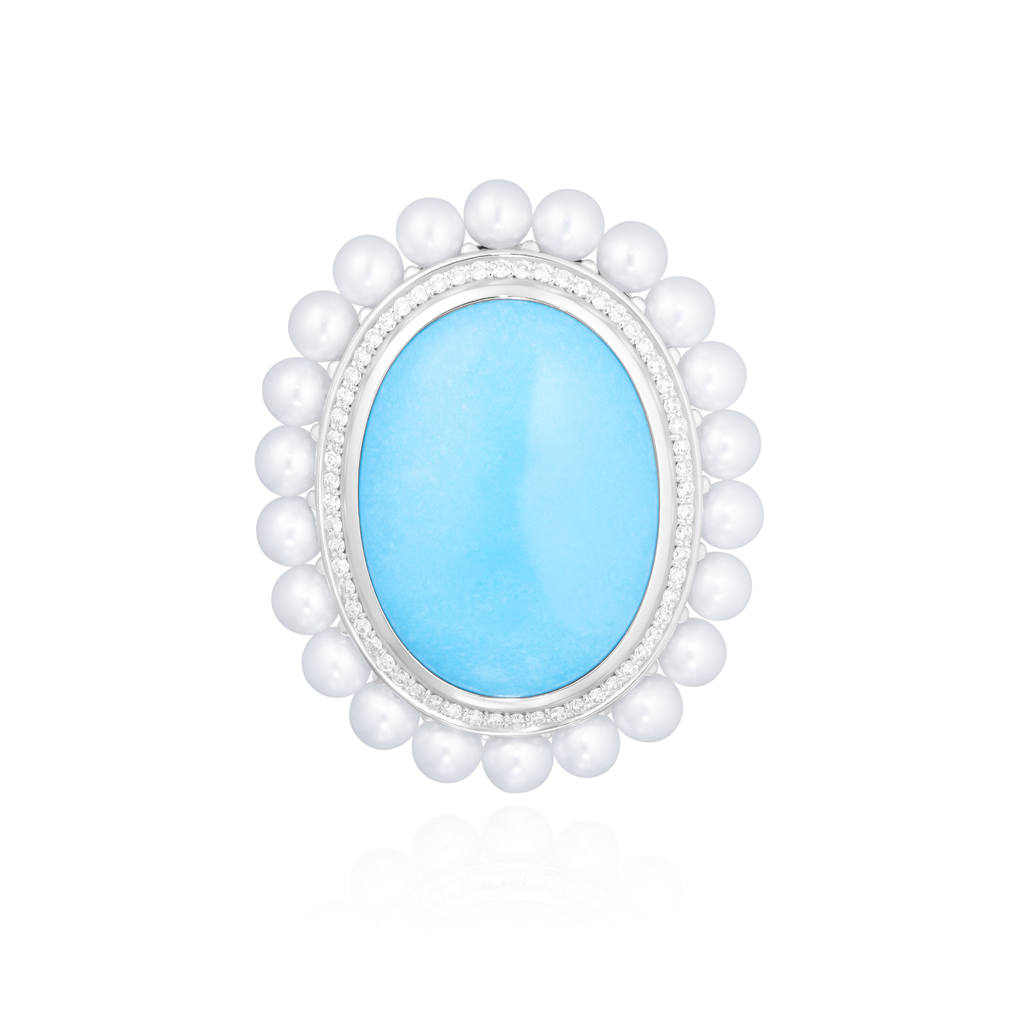 Кольцо из белого золота с бриллиантами, бирюзой 4.228 ct и жемчугом