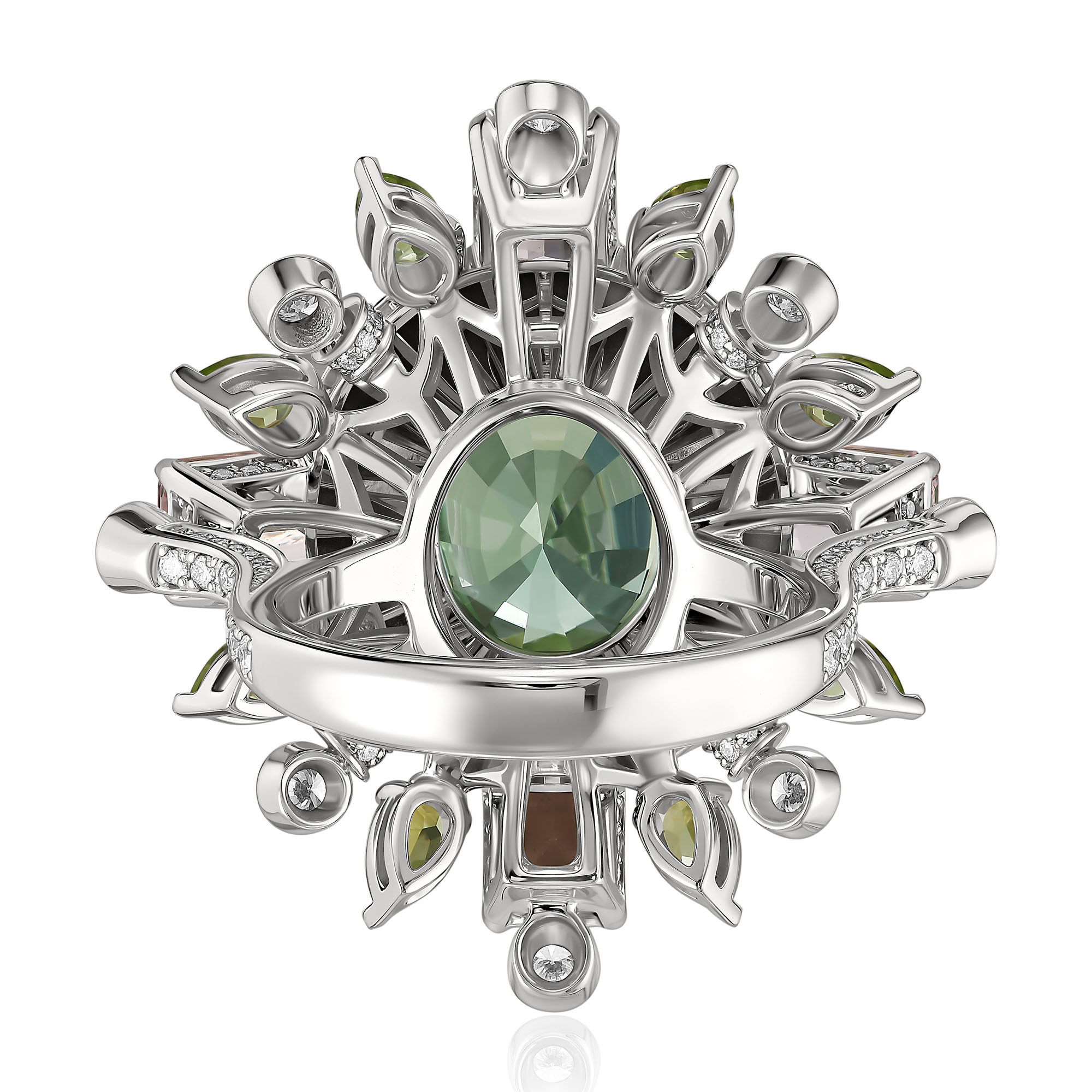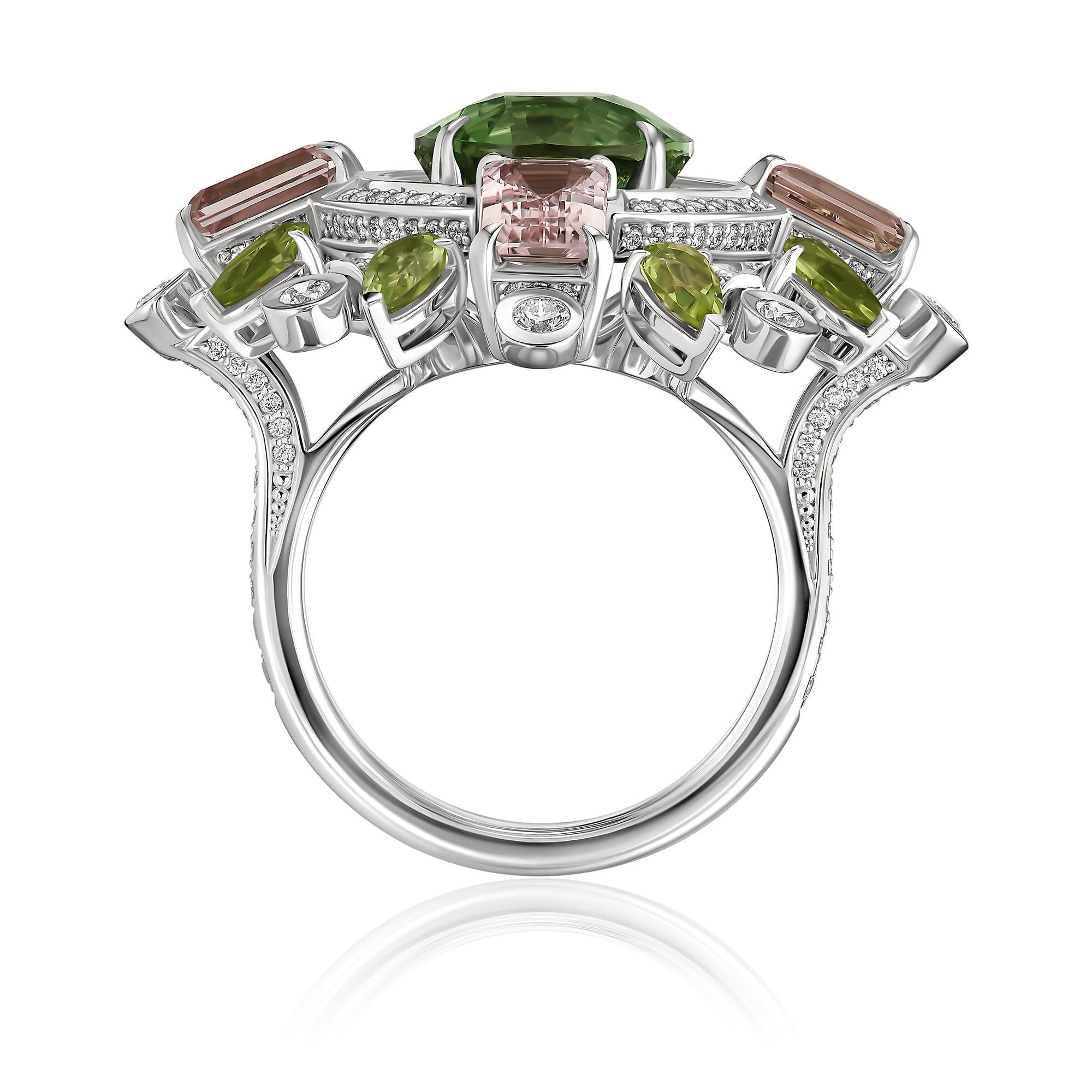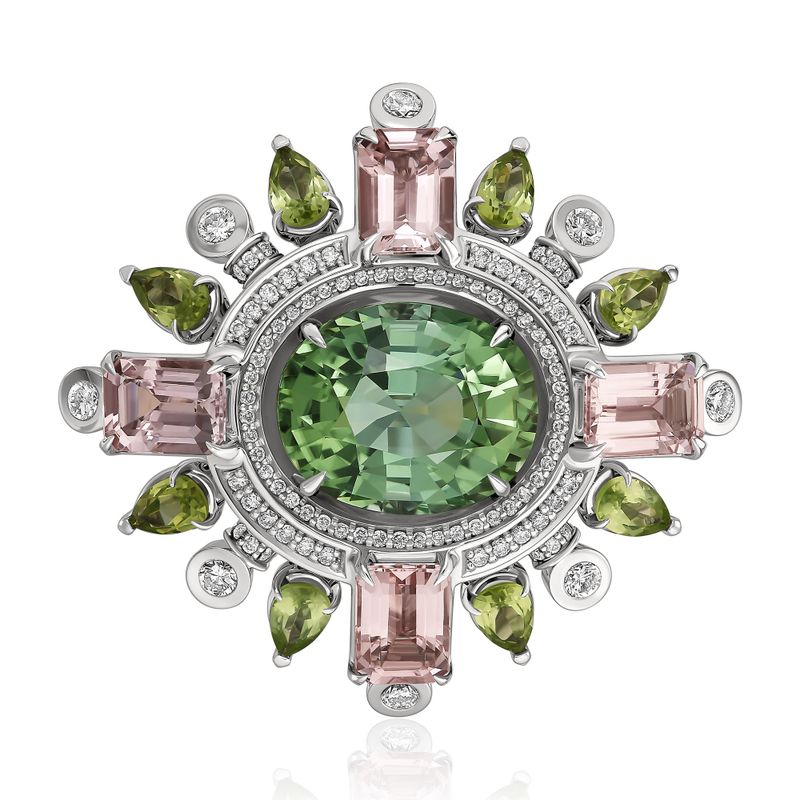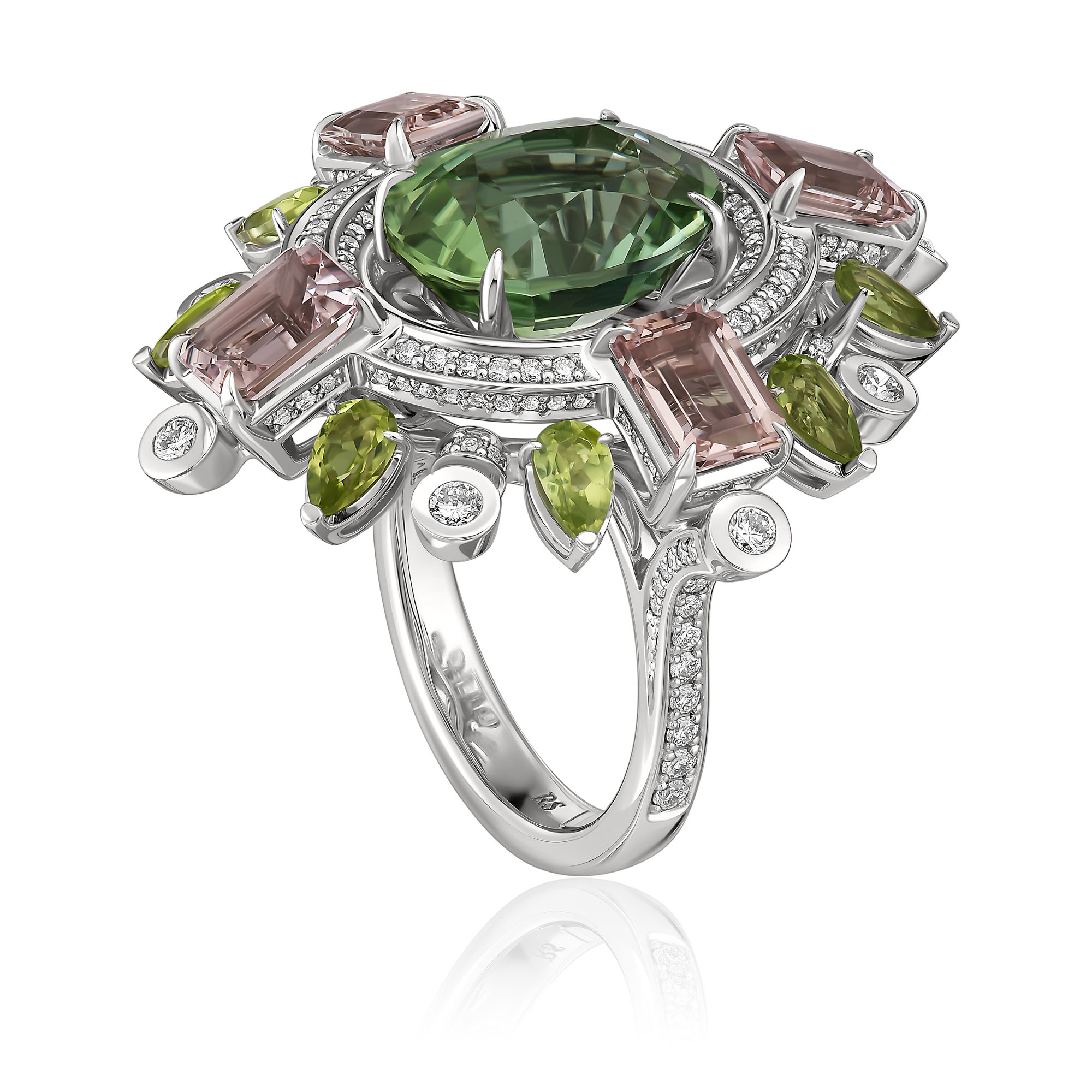 Кольцо из белого золота с бриллиантами, хризолитами 1.85 ct, морганитами 3.465 ct и турмалином 7.38 ct