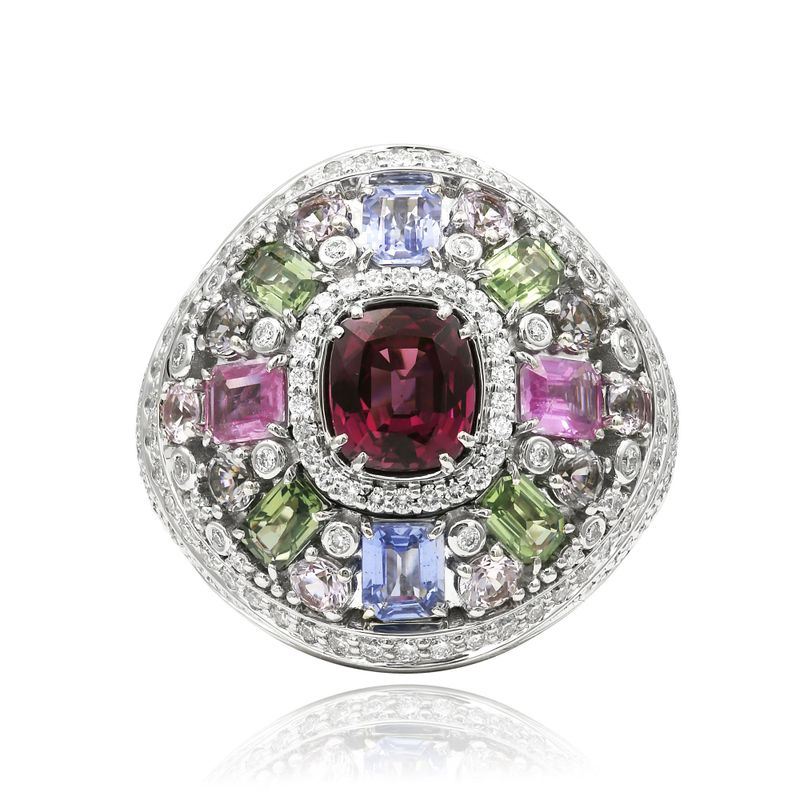 Кольцо из белого золота с родолитом 2.15 ct, сапфирами, шпинелью и бриллиантами