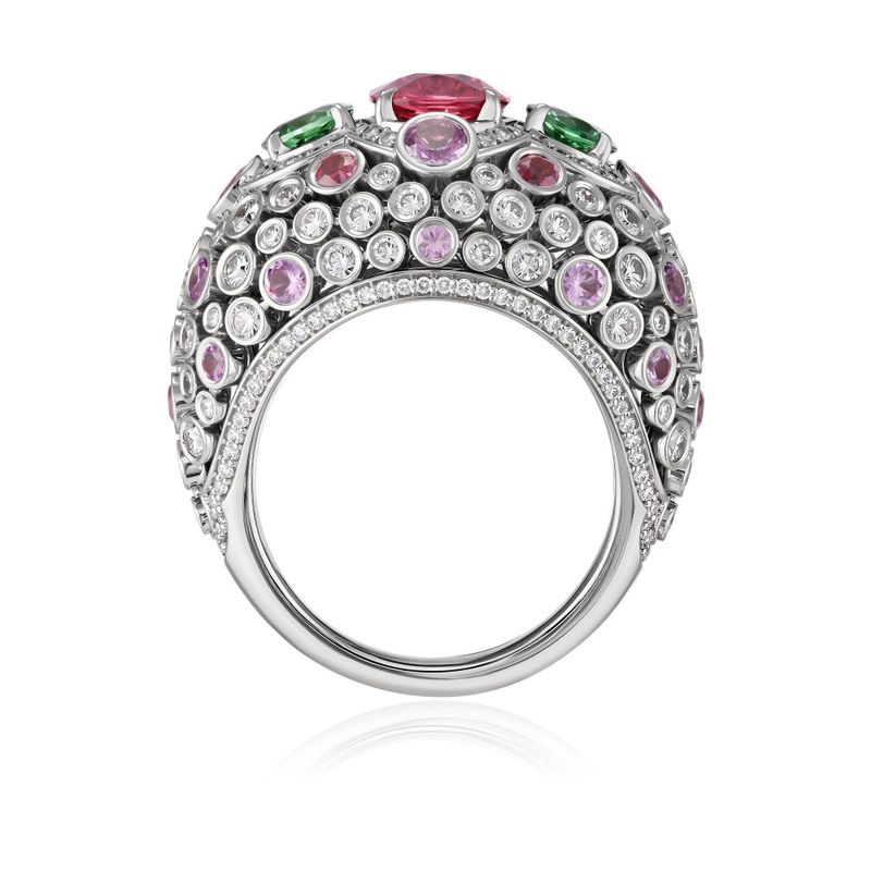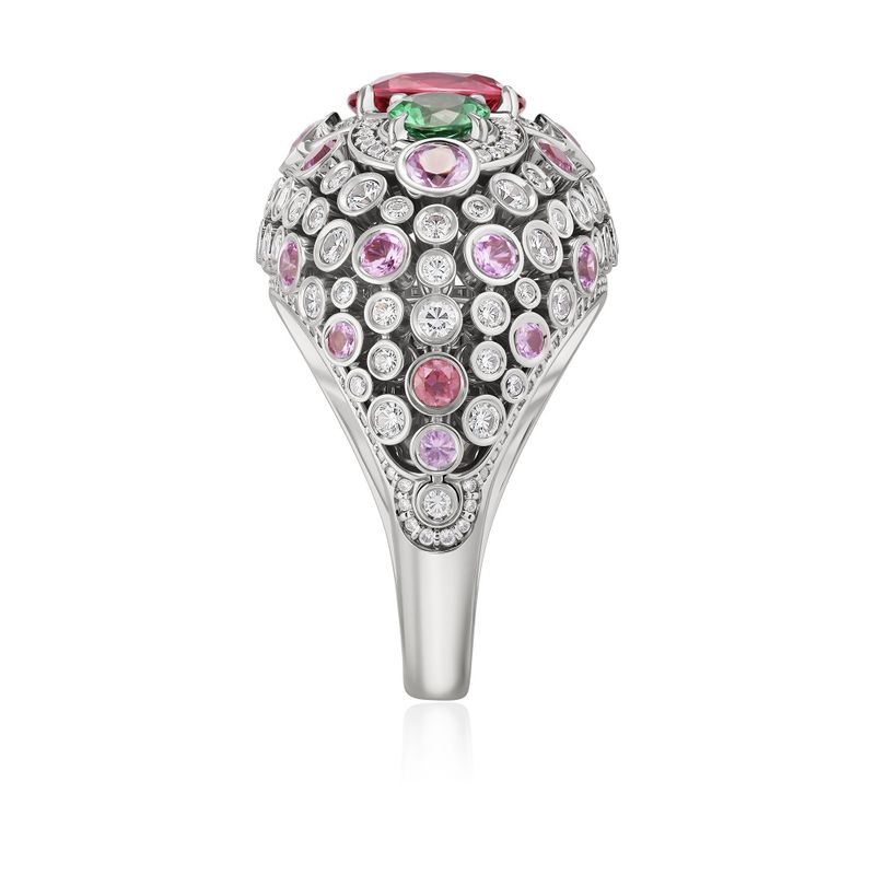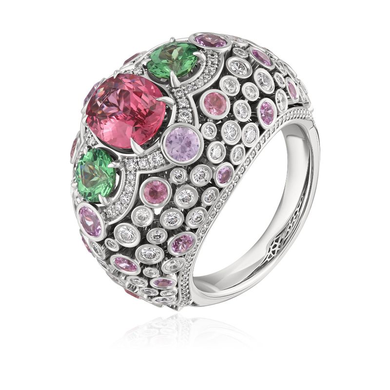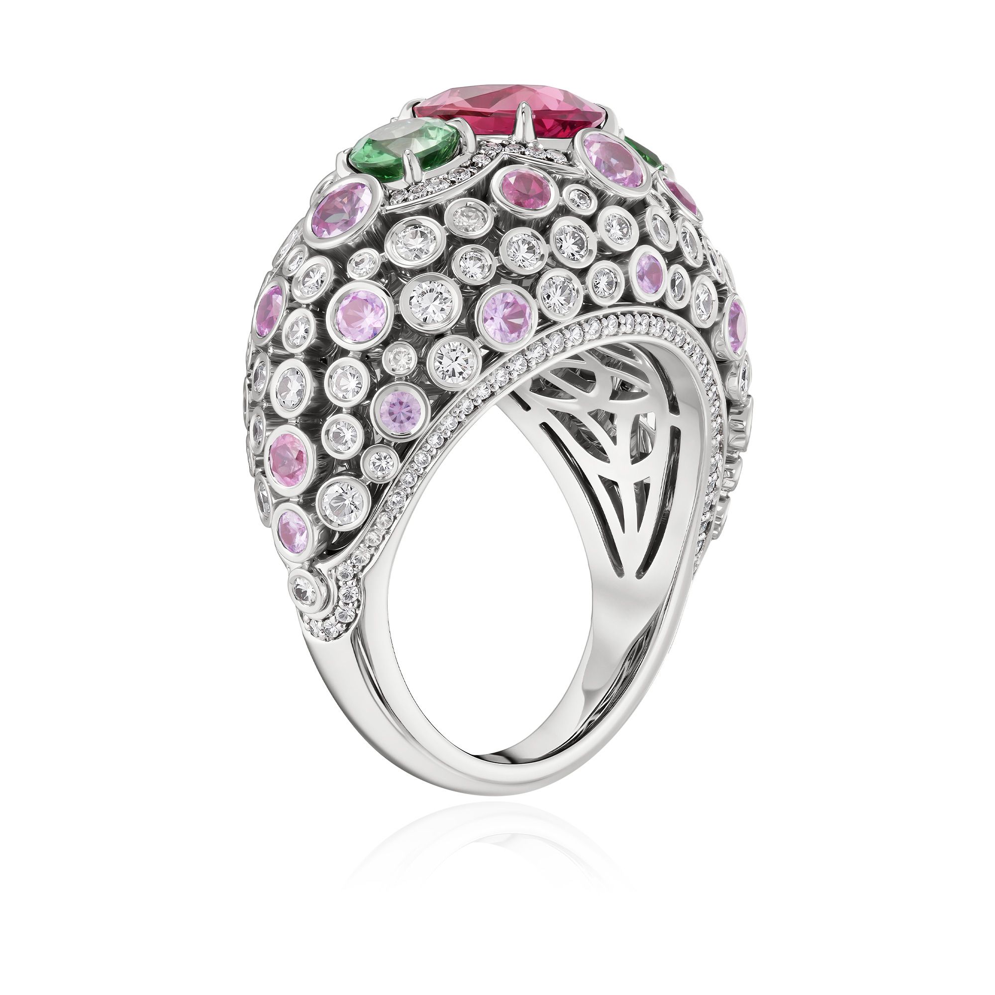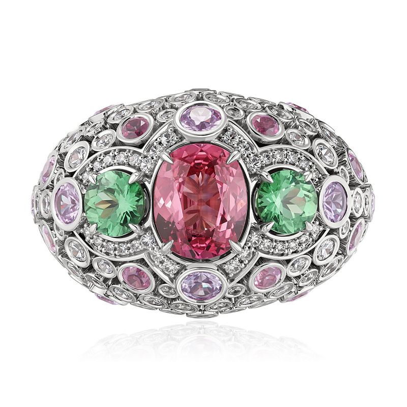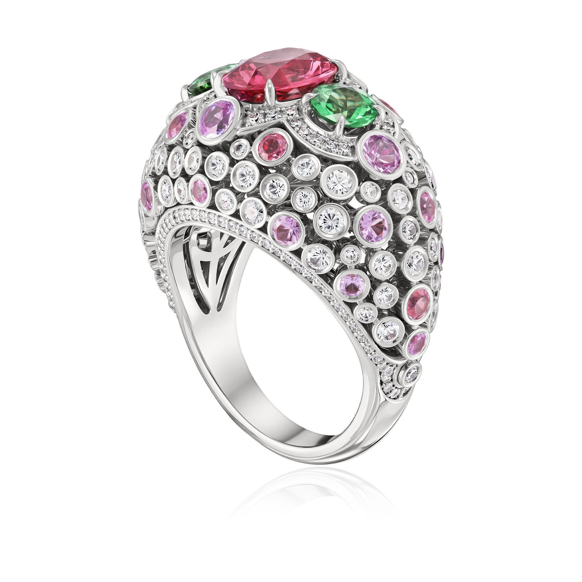 Кольцо из белого золота с сапфирами, бриллиантами, турмалинами, шпинелью 2.13 ct и цаворитом 1.18 ct