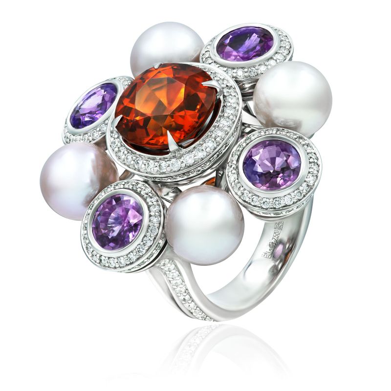 Кольцо из белого золота с сапфирами, гранатом 5.54 ct, бриллиантами и жемчугом
