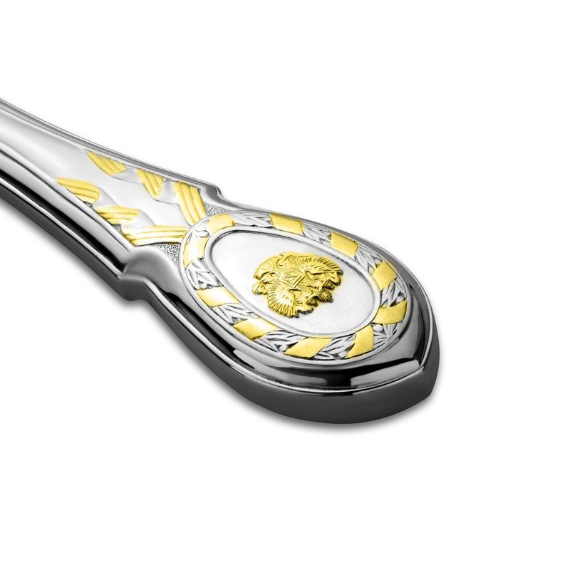 В основу дизайна столового серебра из набора «Государственный» легли изделия поставщика Двора Его Императорского Величества купца 3-й гильдии Павла Сазикова. Предметы сервировки стола, декорированные гербом России, подаются на приемах Московского Кремля и Константиновского дворца в Стрельне.