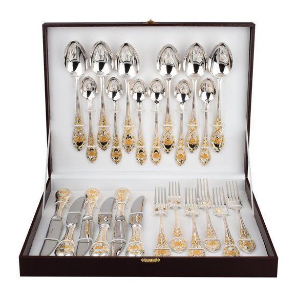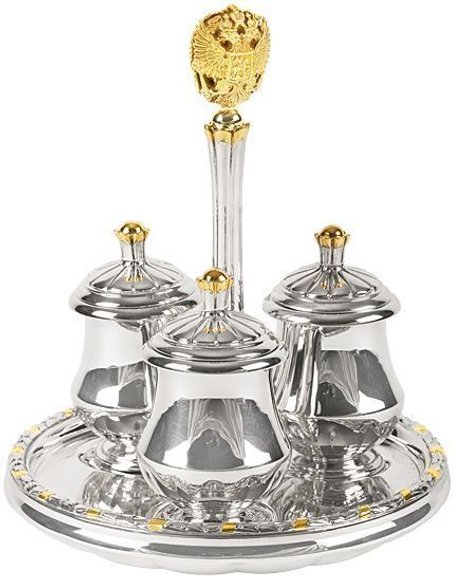 В основу дизайна столового серебра из набора «Государственный» легли изделия поставщика Двора Его Императорского Величества купца 3-й гильдии Павла Сазикова. Предметы сервировки стола, декорированные гербом России, подаются на приемах Московского Кремля и Константиновского дворца в Стрельне.