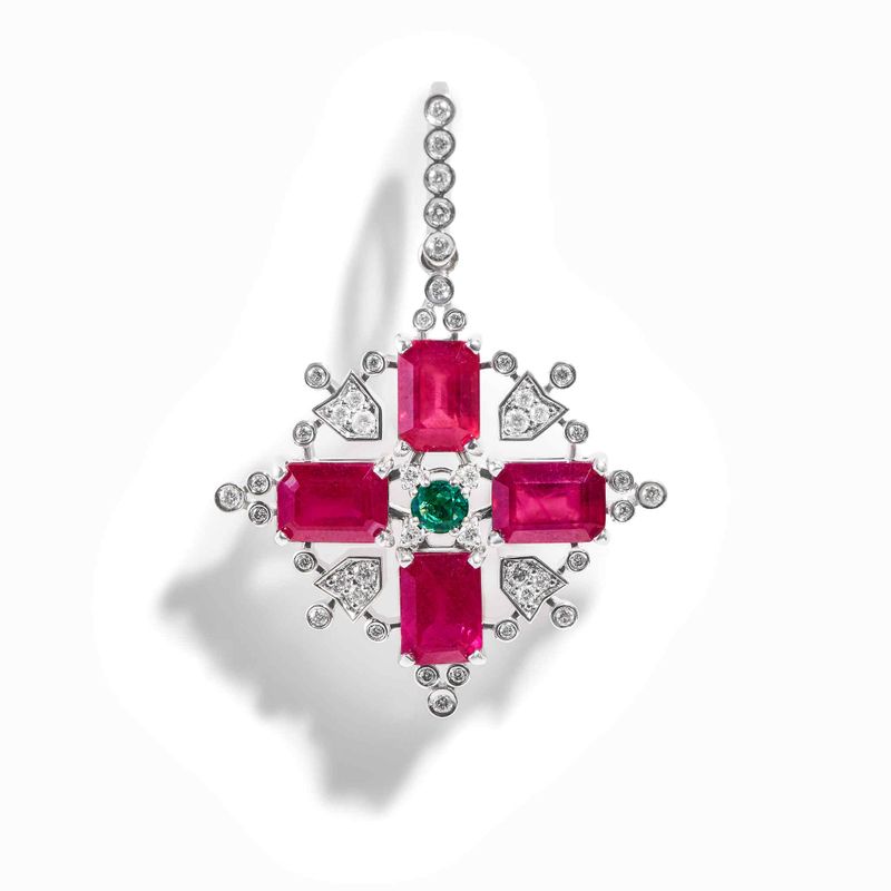 Подвеска из белого золота с изумрудом, рубинами и бриллиантами