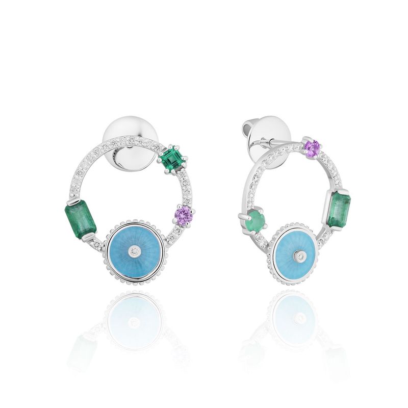 Пусеты из белого золота с изумрудами, сапфирами и бриллиантами