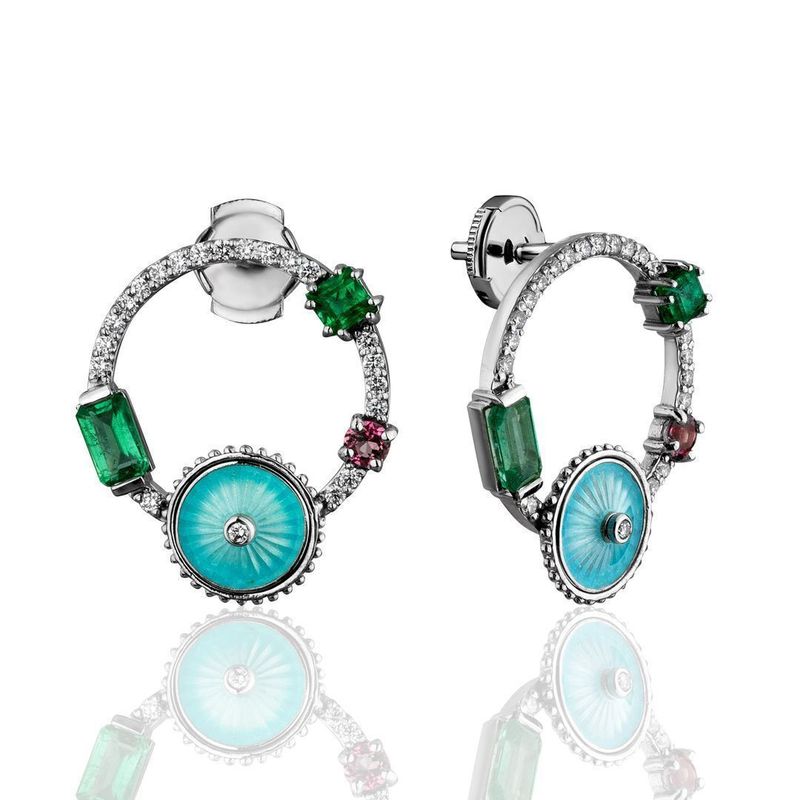 Пусеты из белого золота с изумрудами, турмалинами и бриллиантами