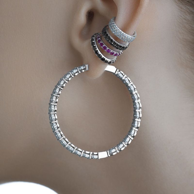 Серьга кафф из белого золота с бриллиантами и рубинами