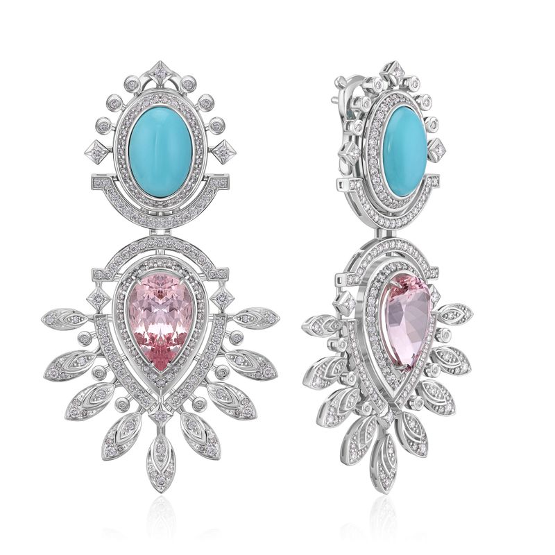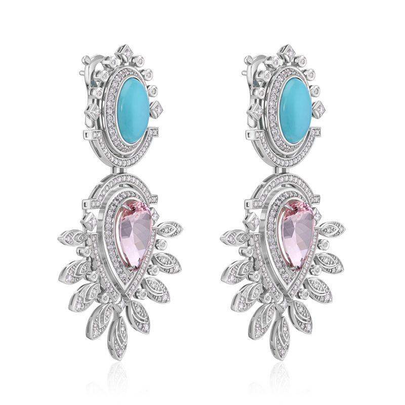 Серьги из белого золота с бриллиантами, морганитами 7.17 ct и бирюзой