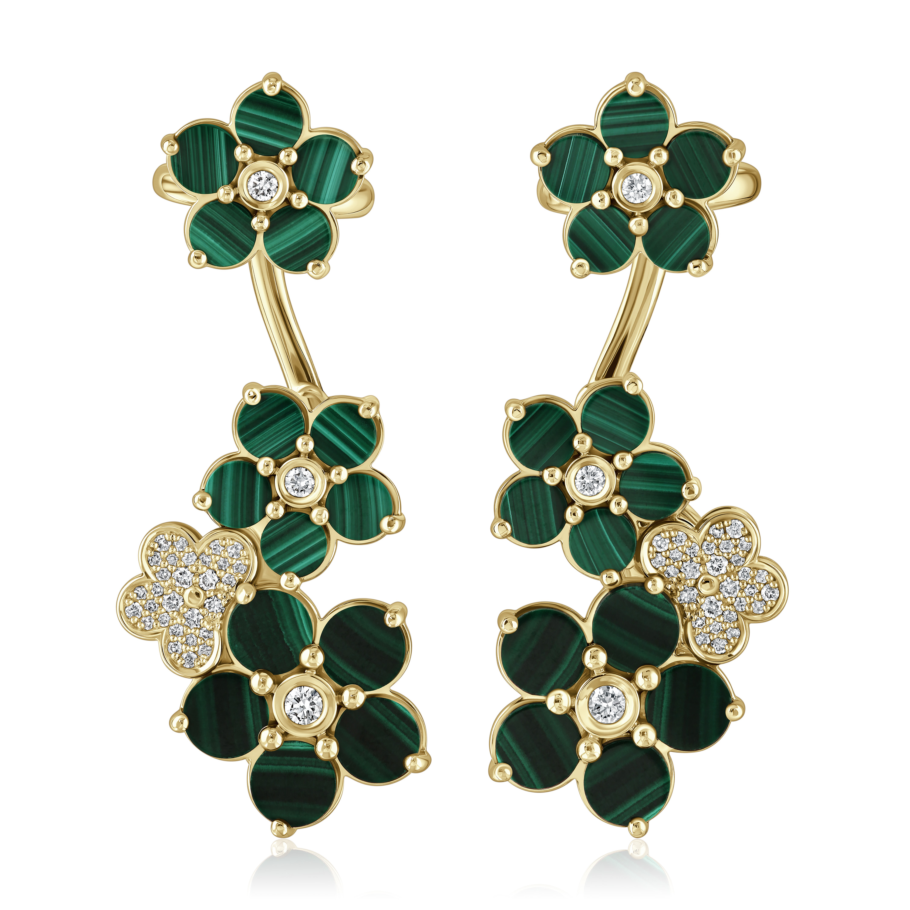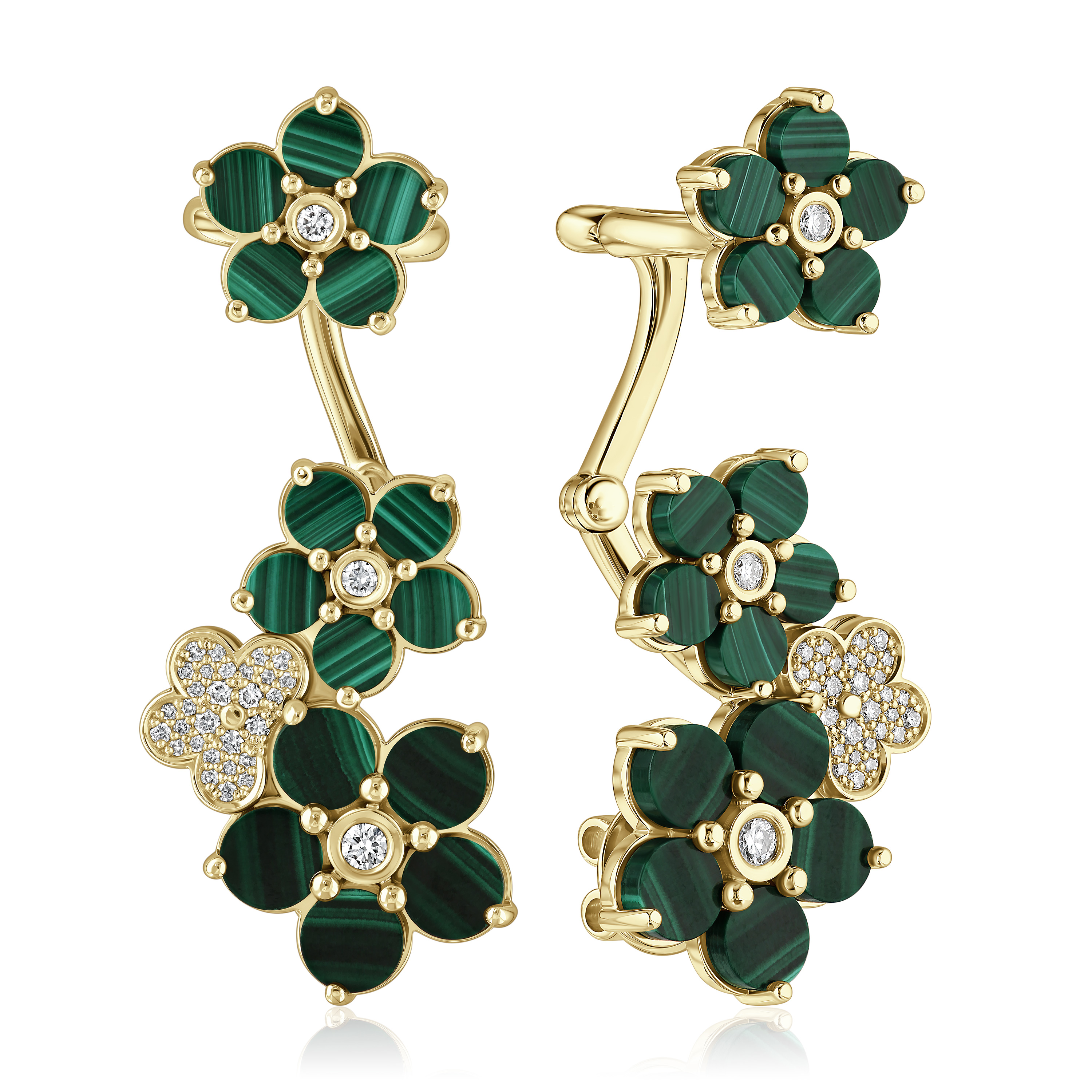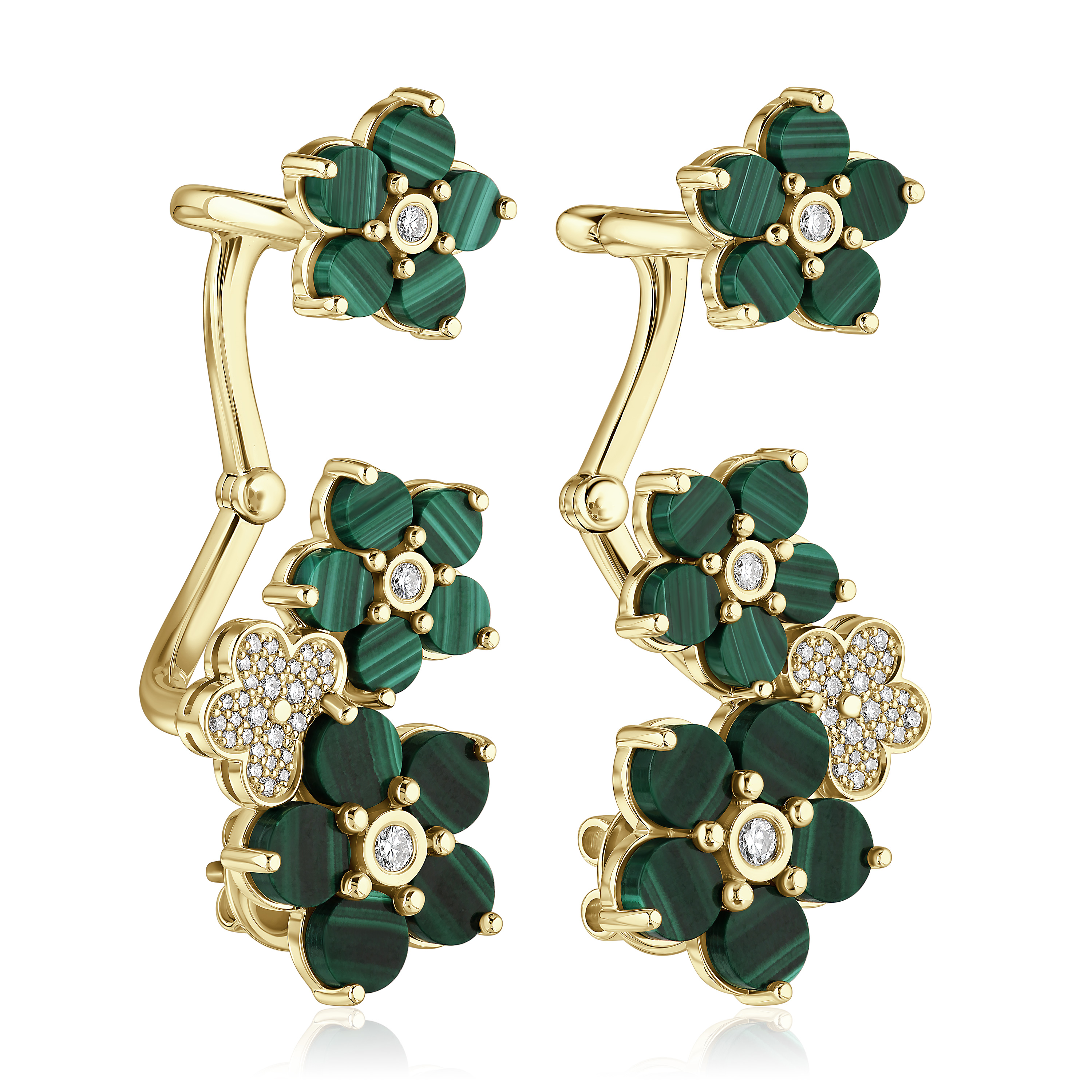 Серьги каффы из желтого золота с малахитами и бриллиантами