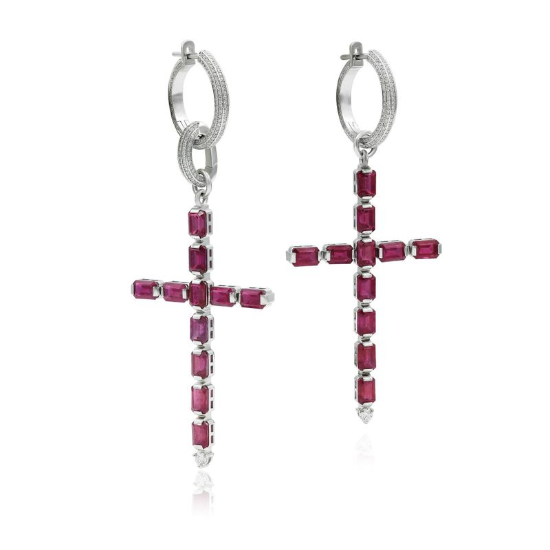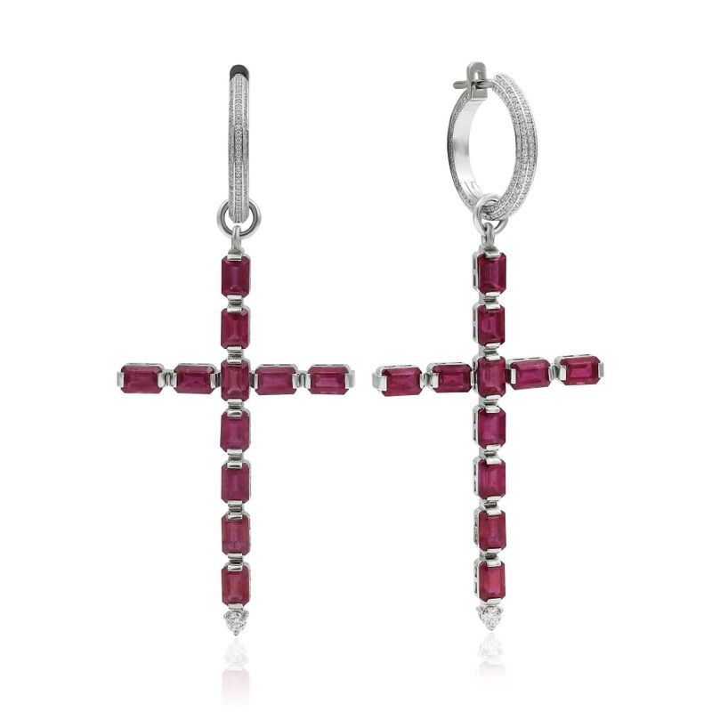 Серьги-кресты из белого золота с рубинами и бриллиантами